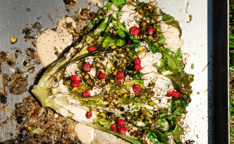 The way I like to compose a dish to make sure it ticks all the boxes is to have contrast in temperature, in texture, and in flavor. Here, the grilled salad comes with a creamy cod liver dressing, some pickled wild strawberries for acidity, and fried sprouted lentils for the crunch. This is, in a way, a Caesar salad reinvented, and, of course, you should feel free to play around with the components, keeping only the technique. For example, the cod liver sauce could be replaced with a flavored mayonnaise for a vegetarian version (think sriracha if you like spice, soy sauce for umami…). You can pickle any damn old vegetable or fruit lying around, or just pop open a jar of pickled cornichons or capers… and if you can’t be bothered sprouting and frying lentils (which I can understand), get out some fried onions, make some croutons with stale bread, or even smash a bag of shop-bought chips to delicious crumbs. It’s all about the crunch! Okay, now onto the recipe.