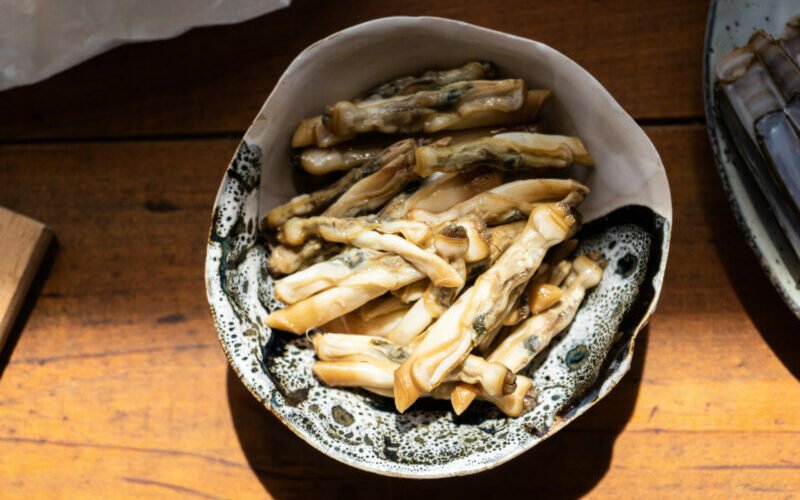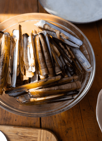 Of all the seafood and fun shells one can think of, razor clams seem to have gotten a bad rap. Not as fancy as oysters or clams, razor clams are on the cheaper end of the seafood world, which means you shouldn’t be afraid of messing around with them a little bit. This recipe is a spin on the traditional seafood and white wine pairing, which usually has us opening mussels or clams in some chardonnay steam, but it plays on one of my favorite hobbies, fermentation, using kombucha instead. If you have ever tried your hand at it, you might have started with some lacto-fermentation (sauerkraut, kimchi), then went on with sourdough bread, or kefir, and if you went next-level you might have tried making tempeh or kombucha. (If you got to making your own miso or tamari, well, congratulations, I’m a little bit jealous.) This is where I’m at, and kombucha bottles are lined up on my shelves as we speak.
