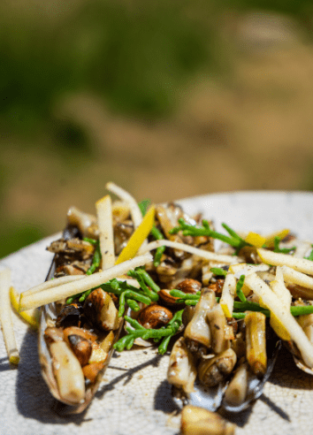 Soak the clams in a bath of cold salted water for one to two hours to get the sand out. You can now take out the clams from the shells, but keep those for presentation. Chop, chop, chop the clams into two or three pieces each, nothing smaller, and put them in a bowl. Drizzle with the oil and the kombucha and leave to marinate for 15 to 20 minutes.