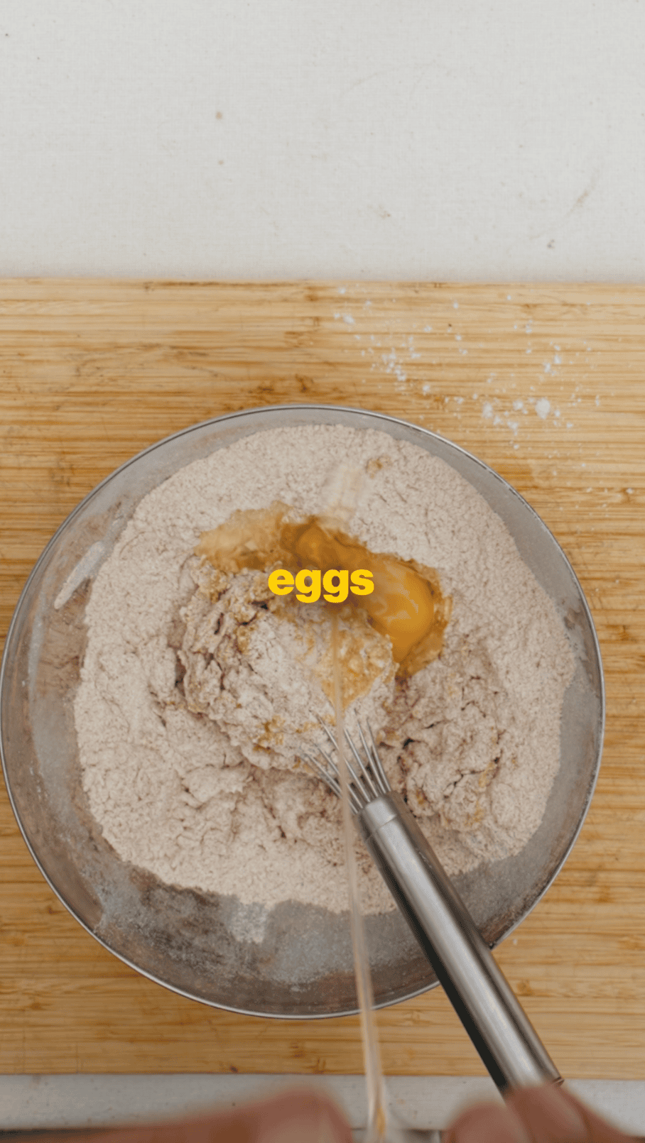 - In a mixing bowl, combine all the dry ingredients. Add the eggs and miso, and mix with a whisk until well combined.