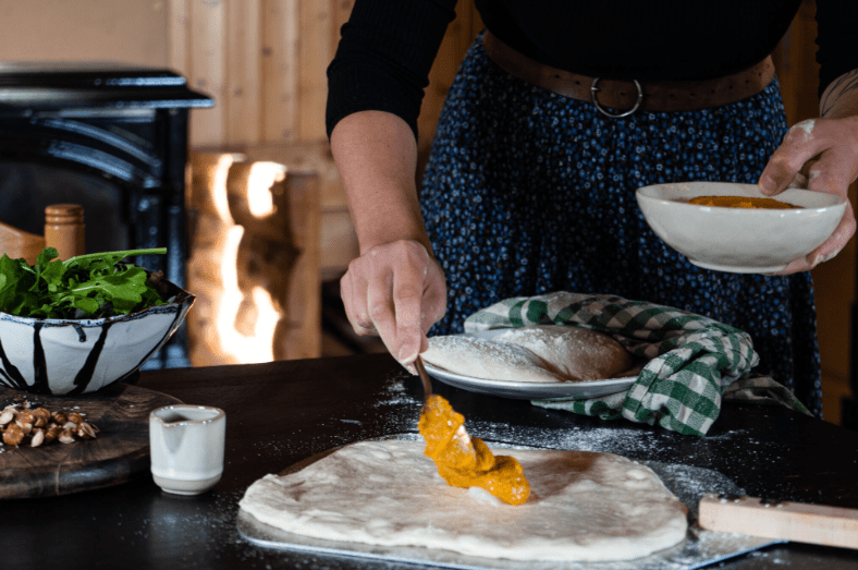 Once your pizza dough is nearly ready to use, set your oven at its highest temperature with your Stadler Made Steel inside. Leave to heat for at least 30 minutes. Use Pieter’s video in this article if you are unfamiliar with how to stretch your dough ball. Spread some squash puree on your pizza base and place on the steel. During the time it takes to cook it, you can chop your hazelnuts, toss your rocket leaves in some olive oil, salt, and pepper, and put some music on. Once the dough is puffed and slightly blackened, get the pizza out and add all the other ingredients: the chopped nuts, the arugula salad, and drizzle your balsamic reduction on top. Voilà !