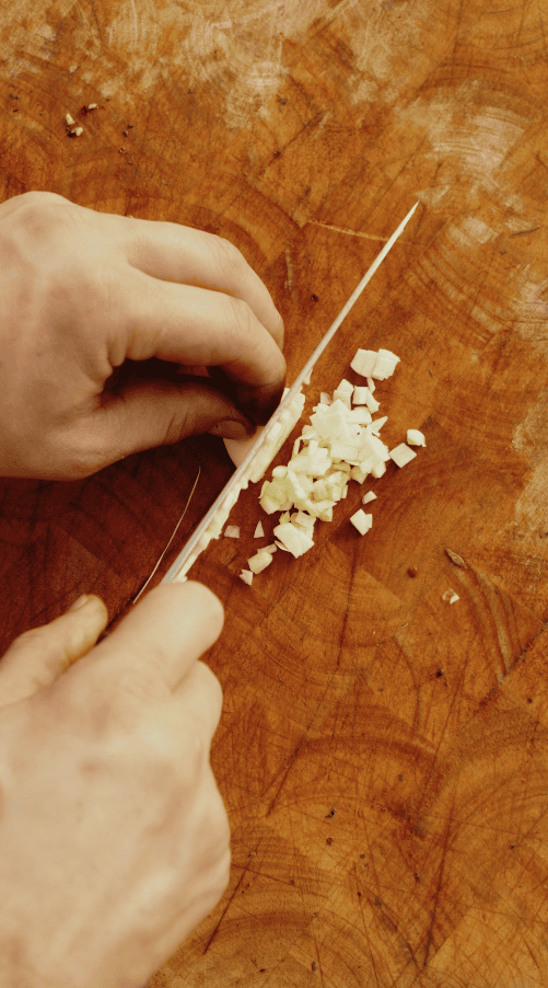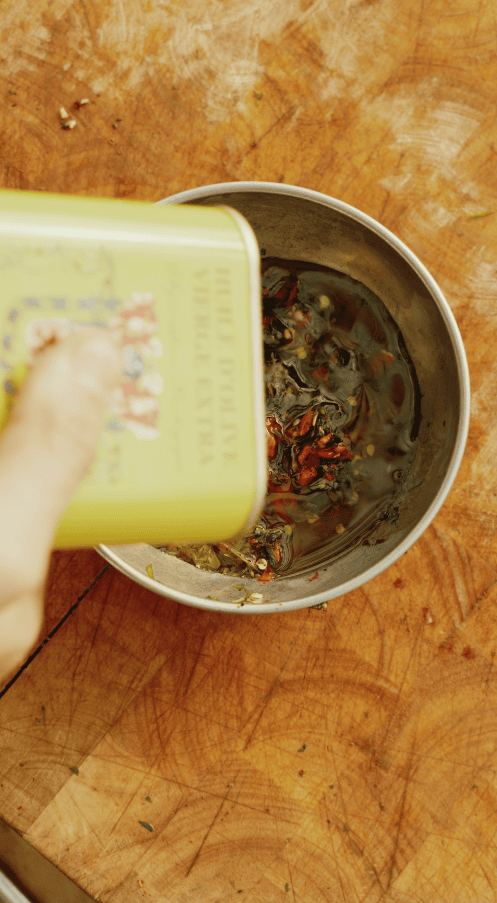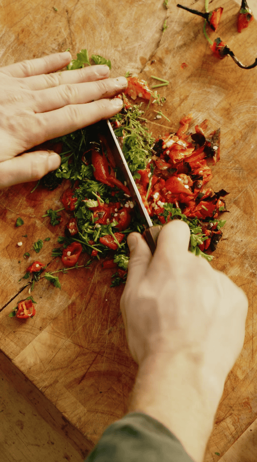 3. Combine all the herbs and chillies in a bowl and chop them together until well mixed. Add finely chopped garlic, a generous splash of olive oil, red wine vinegar, and salt to taste.