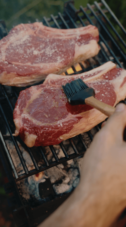 4. Grill the steak directly over the flames, basting with butter and seasoning with coarse salt. Cook each side for about 2 minutes.