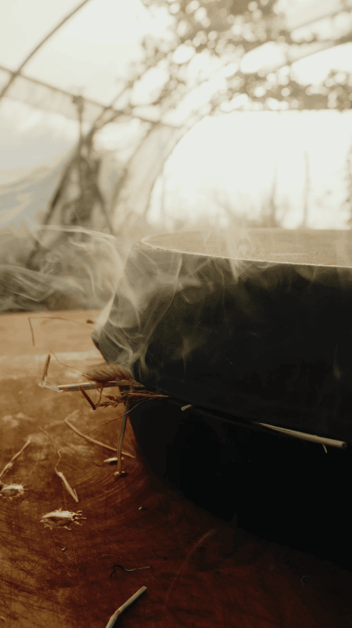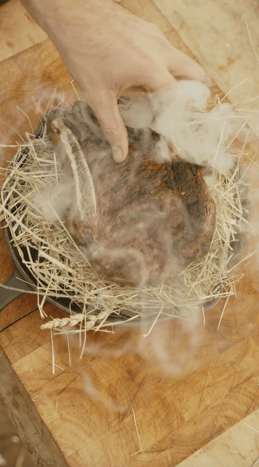 5. Remove some burning coals and place them in a fireproof dish. Lay hay over the coals so that it begins to smoke immediately. Place the steak on top of the hay and cover it with another pan to allow the meat to rest and absorb the smoky flavour from the hay.
