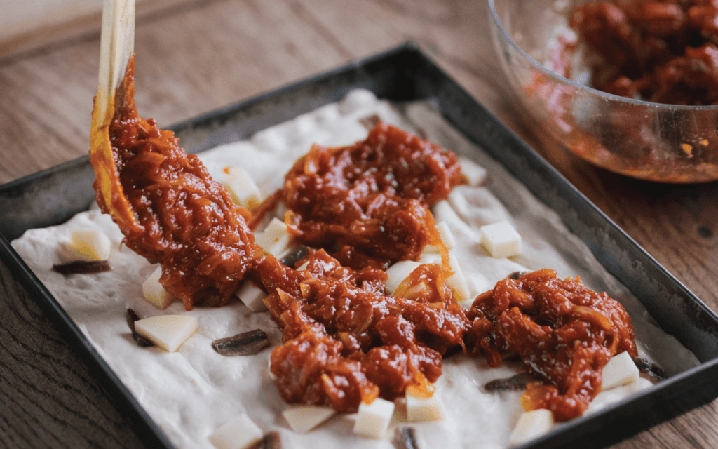 While it’s not the only way to make a Sfincione dough, it’s often made using the direct method. With the direct method, all ingredients are mixed together in one go, without any pre-ferments or complex stages. By combining the ingredients directly and allowing for adequate rising time, the dough develops the desired characteristics: it becomes soft, spongy, and capable of supporting the rich toppings typical of Sfincione.