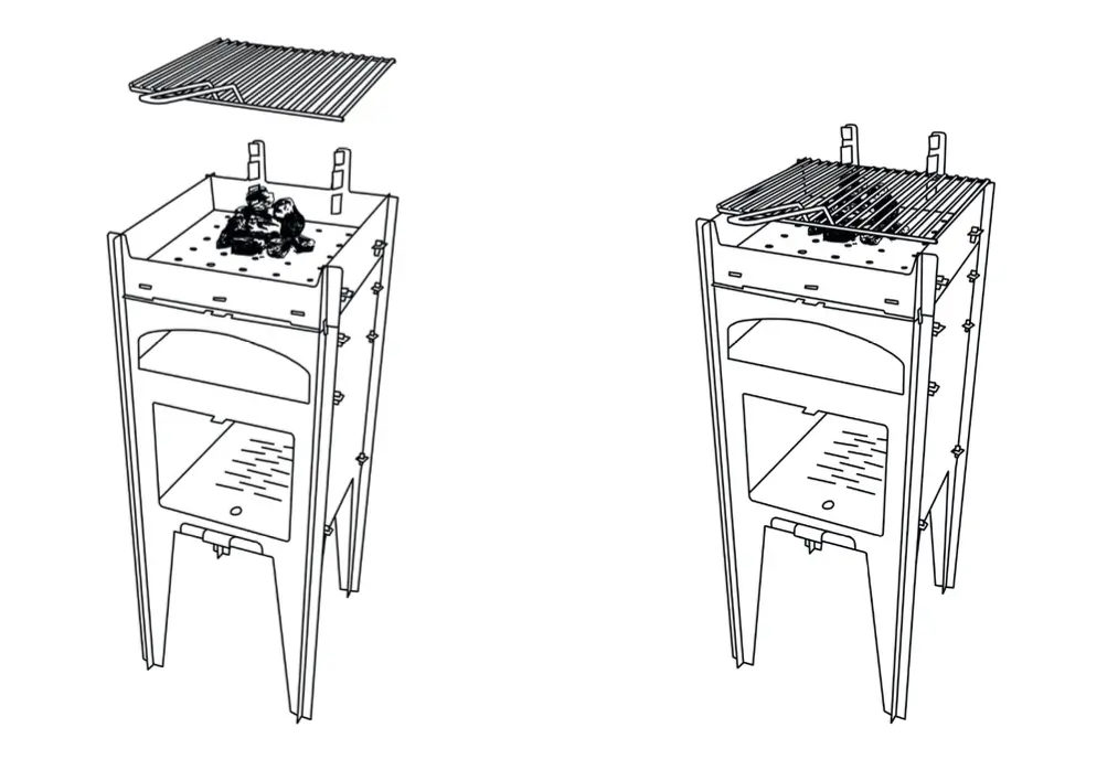 Place and fasten the BBQ kit on top of the Outdoor Oven, add some coal, insert the grill, and you are ready for action.