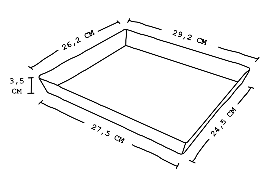 The bottom edge measures 27.5 cm (10.8”) long and 24.5 cm (9.6”) wide. It is 3.5 cm (1.4”) deep.